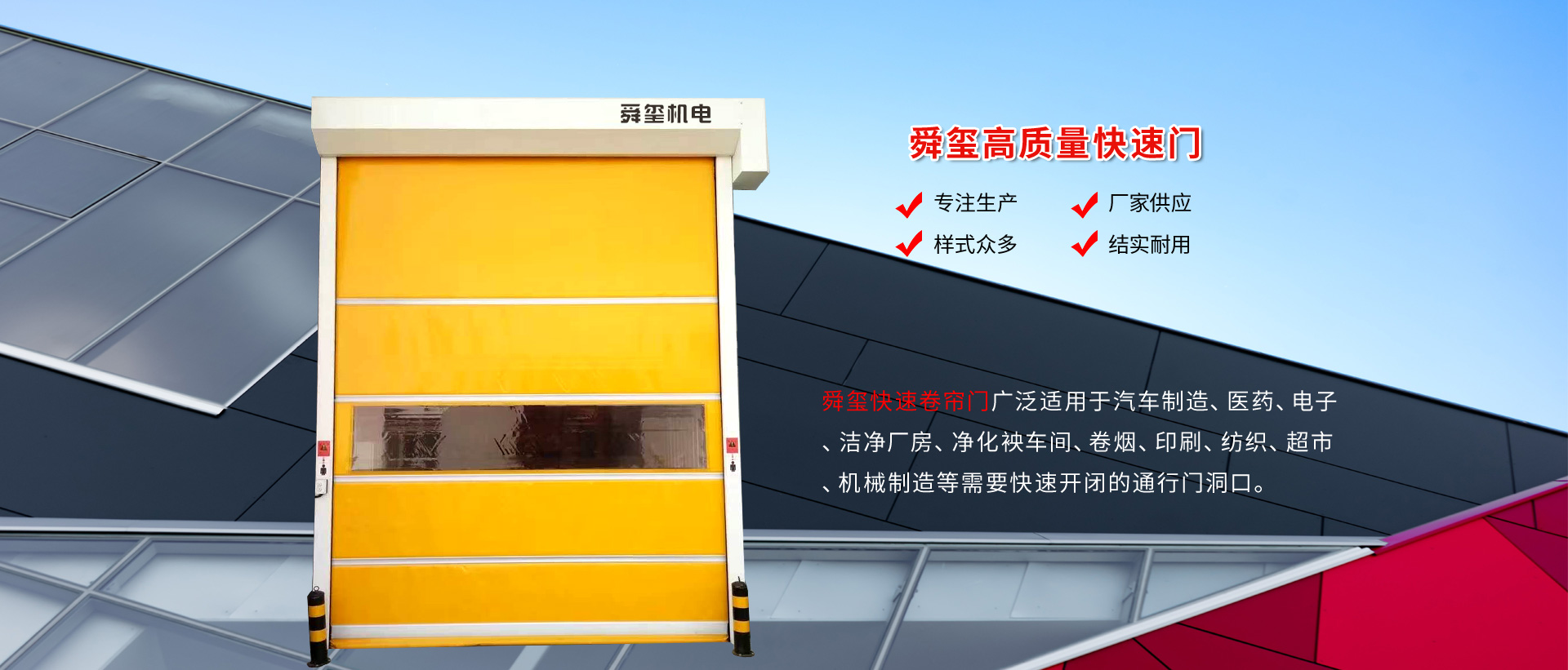 河北舜璽機(jī)電設(shè)備有限公司主要產(chǎn)品快速卷簾門、快速堆積門、硬質(zhì)螺旋快速門、雙層柔性機(jī)庫門、工業(yè)提升門、上滑道車庫門、汽車4S店透視門、卸貨平臺(tái)、工業(yè)門封、大型工業(yè)電扇等各類相關(guān)電動(dòng)門、自動(dòng)門和物流設(shè)備。
